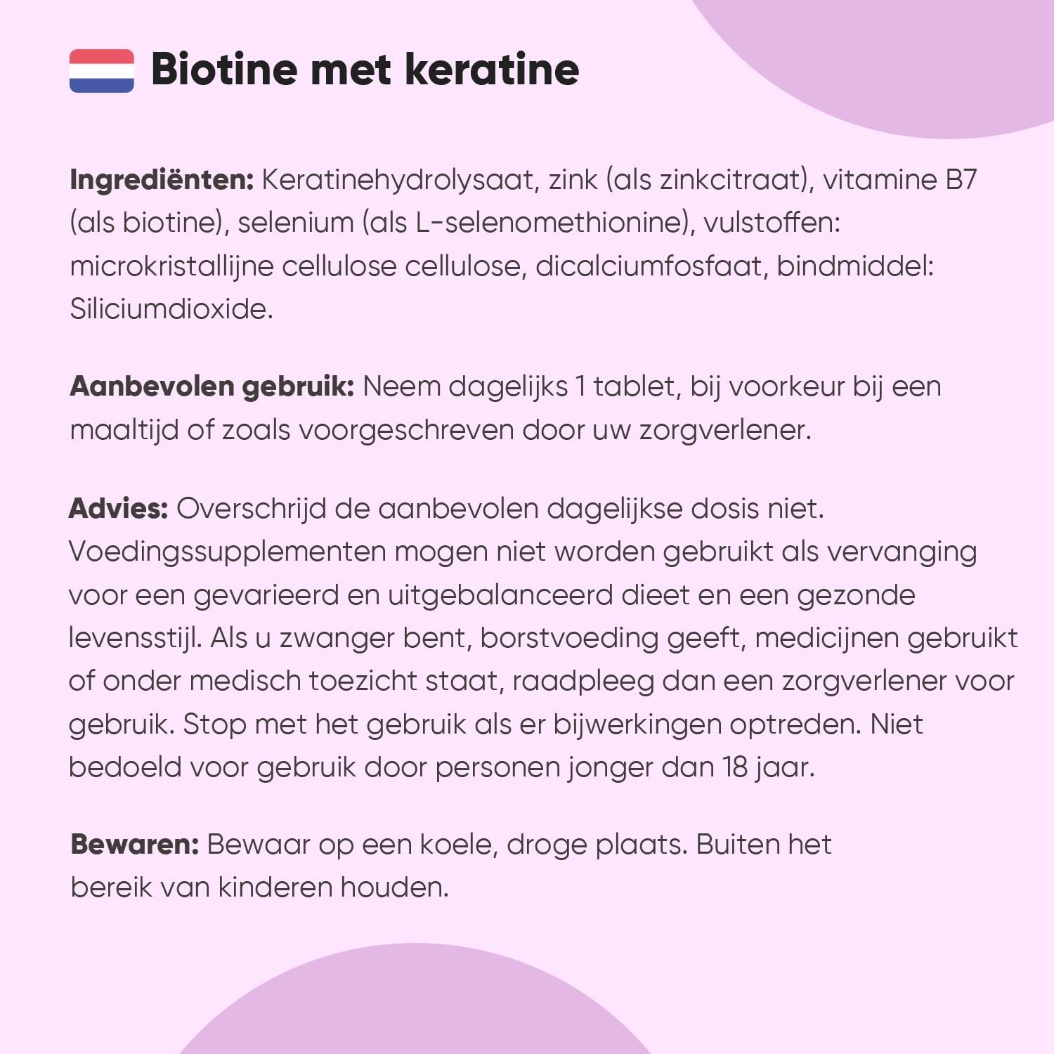 Ce complément est idéal pour tous ceux qui souhaitent un soutien supplémentaire pour leurs cheveux, leur peau et leurs ongles. Grâce à la combinaison unique de biotine, de zinc, de sélénium et de kératine, il contribue à une apparence soignée et à la vitalité. En outre, les comprimés sont entièrement végétaliens, sans OGM et sans gluten, ce qui les rend adaptés à presque tous les styles de vie.