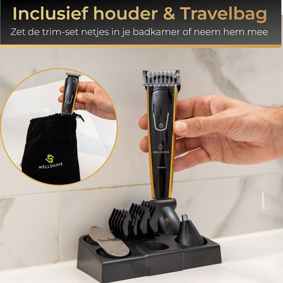 La tondeuse à barbe et toilettage corporel Wellshave est livrée avec 5 accessoires pour un toilettage optimal. Elle comprend également un sac de voyage pratique et un accessoire avec cadran pour les longueurs de 1 mm à 9 mm ! L'ensemble de la tondeuse est étanche aux éclaboussures, mais NOT à l'eau. N'immergez donc pas cet appareil dans l'eau et ne l'utilisez pas dans des endroits où il est trop en contact avec l'eau. Tous les accessoires sont facilement lavables. Nous proposons également un support pour le coupe-bordures dans lequel vous pouvez ranger tous les accessoires, le chargeur et le coupe-bordures. Le coupe-bordures est équipé d'une batterie Li-ion. Chargez le coupe-bordures pendant 2 heures pour 1,5 heure d'utilisation !