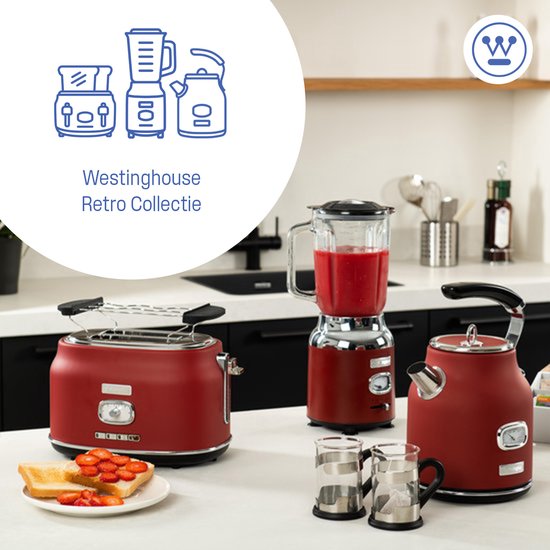 Dans la même lignée, Westinghouse propose une gamme d'appareils électroménagers : Retro Kettle, Retro Toaster 4 Slices, Retro Blender, Retro Stick Blender et Retro Hand Blender. L'ensemble de la série Retro est disponible en 3 couleurs : blanc, rouge et noir.
