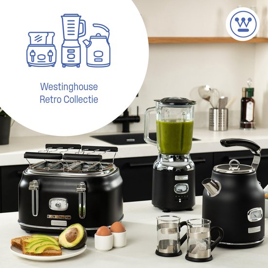 Dans le même style, Westinghouse propose également les appareils de cuisine suivants : Retro Kettle, Retro 4 Slice Toaster, Retro Blender, Retro Hand Blender.xer in Retro Toaster. La série complète Retro est disponible en trois couleurs différentes : blanc, rouge et noir.