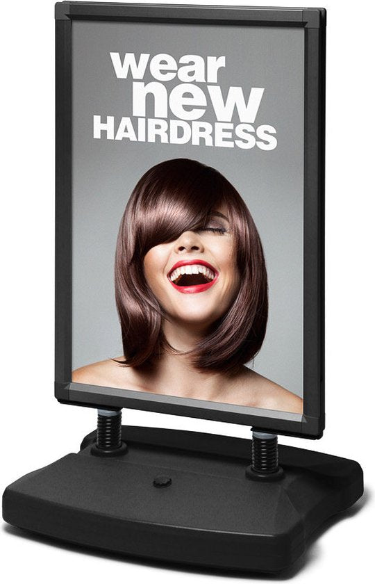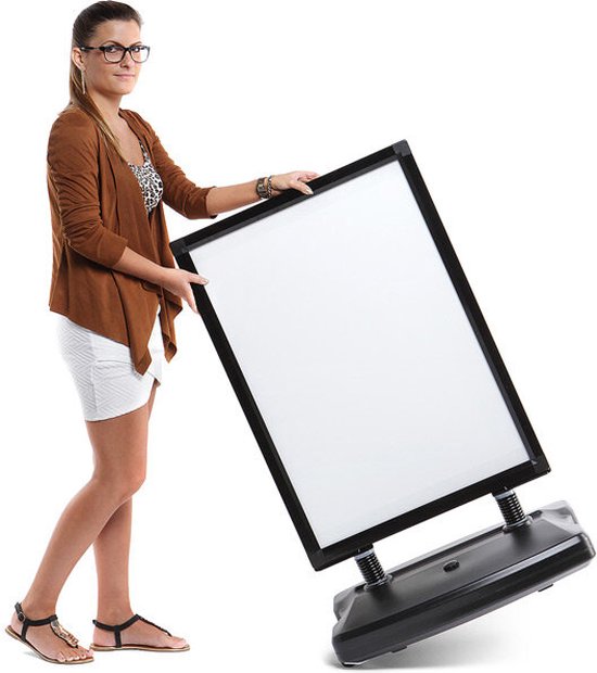 Attirez l'attention des passants sur votre marque, vos produits ou vos offres avec le panneau de trottoir Windtalker City Plastic Foot. Il s'agit d'un excellent choix pour l'extérieur, facile à déplacer grâce aux roues intégrées. La base en plastique peut être remplie d'eau ou de sable pour plus de stabilité. Changez votre affiche rapidement et facilement pour votre prochaine publicité ou promotion. Disponible en argent ou en noir. Idéal pour mettre en valeur les offres et les promotions à l'entrée des magasins.