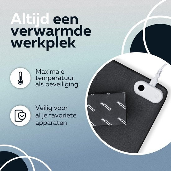 Vous n'aimez pas avoir froid lorsque vous travaillez, ou peut-être souffrez-vous de bras froids qui vous empêchent de vous concentrer ? Nous comprenons à quel point cela peut être ennuyeux. C'est pourquoi nous sommes heureux de vous présenter notre tapis chauffant. Le tapis se réchauffe agréablement pour que vous puissiez toujours travailler confortablement. Maintenant avec un clip pour câble USB. Avec lequel vous pouvez facilement attacher quelques câbles à votre bureau.