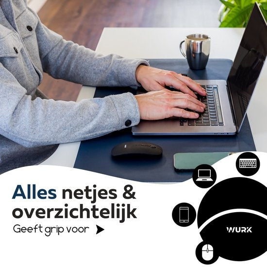 Le sous-main professionnel de Wurk confère à votre bureau un look exceptionnel ! L'organisateur de bureau veille à ce que l'ensemble de votre bureau présente une belle surface plane. Il est donc idéal pour travailler avec un ordinateur portable ou un clavier. Le sous-main est également un tapis de souris d'ordinateur où les ordinateurs portables et les claviers restent fermement sur le tapis. Comprend désormais un clip pour câble USB. Il vous permet de fixer facilement des câbles sur votre bureau.